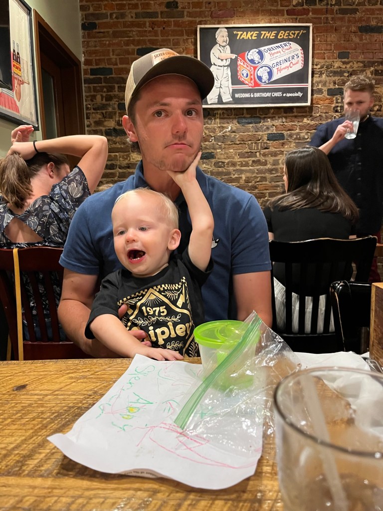 Grammy & Papa Dave’s 50th wedding anniversary dinner at Puckett’s. Such a good venue. They had a room just for us, specialized menu with a few amazing choices, and peach cobbler for dessert (which I didn’t get any of bc I was nursing). Hansen and Eddie both pooped during the dinner and Grace and mom changed them. Scott hosted a trivia game all about Jan and Dave’s life. The siblings each gave a toast- dad teared up telling his first memory as a kid singing I am a child of god with his parents.